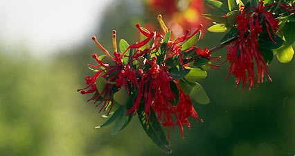 Le Quintral : C’est une plante hémiparasite : synthétisant avec la chlorophylle sa propre matière organique, elle se nourrit grâce à l’eau et les minéraux de l’arbre qui l’héberge. Elle fleurit presque durant toute l’année, même en hiver, et ses fleurs constituent ainsi l’unique source de nectar pour le colibri qui le prélève régulièrement. Les petits singes de montagne, ainsi que les oiseaux fructivores dégustent les fruits que produit le Quintral au printemps et au début de l’été. Cette plante peuple divers Parcs Nationaux de la Patagonie.