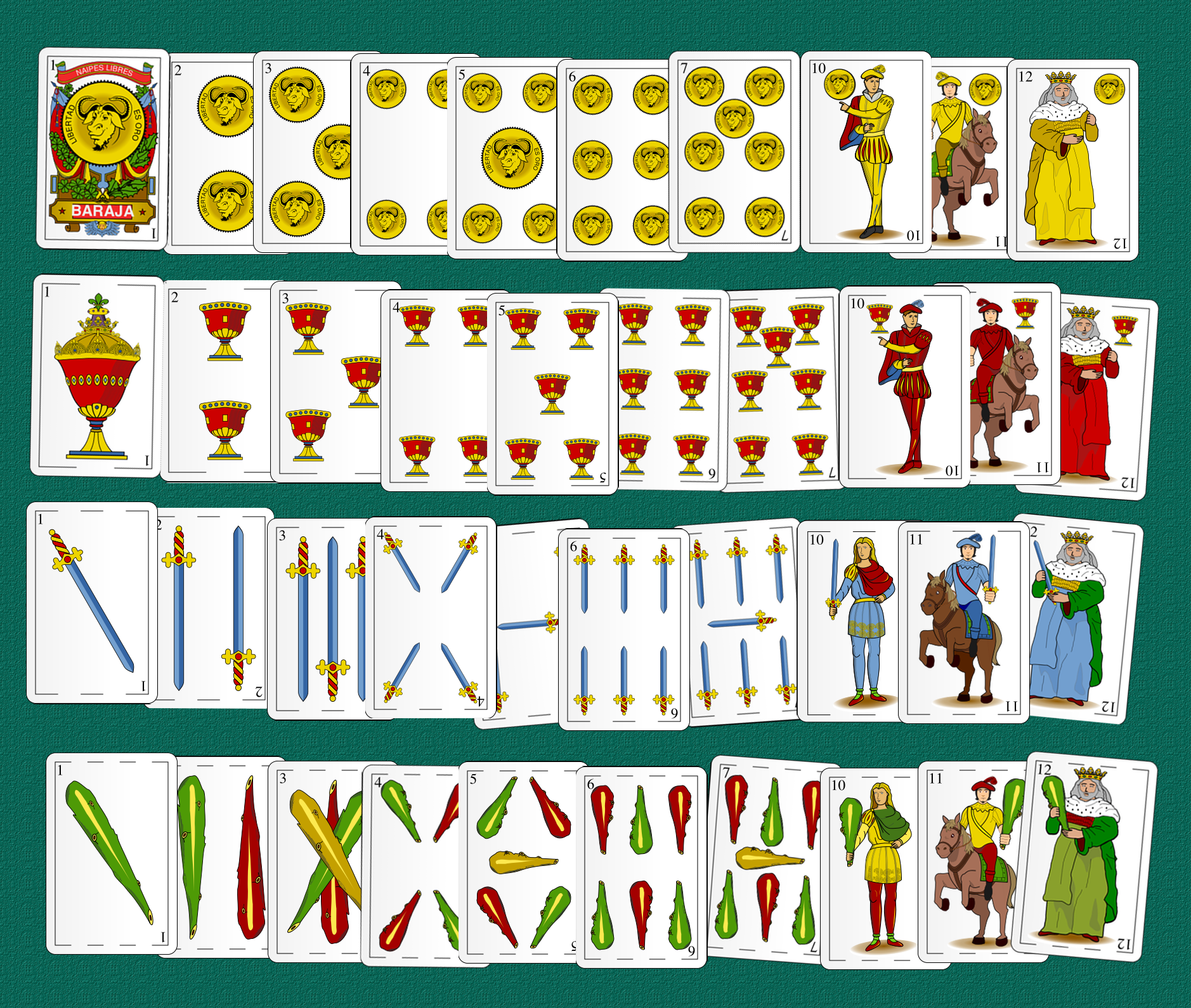 Comme vous pouvez le constater, le truco ne se joue pas avec les cartes que nous avons en France. En effet, ce que vous voyez ci-dessus est un jeu espagnol. Certes, très ressemblant, les couleurs (en Espagnol “Palo”) sont différentes : de haut en bas sur l’image vous avez :